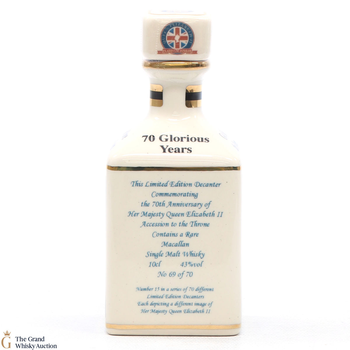 A mini decanter commemorating the 70th Anniversary of Her Majesty Queen Elizabeth II Accession to the Throne. Filled with a rare Macallan, there were only 70 full sets released which consisted of 70 different bottles.