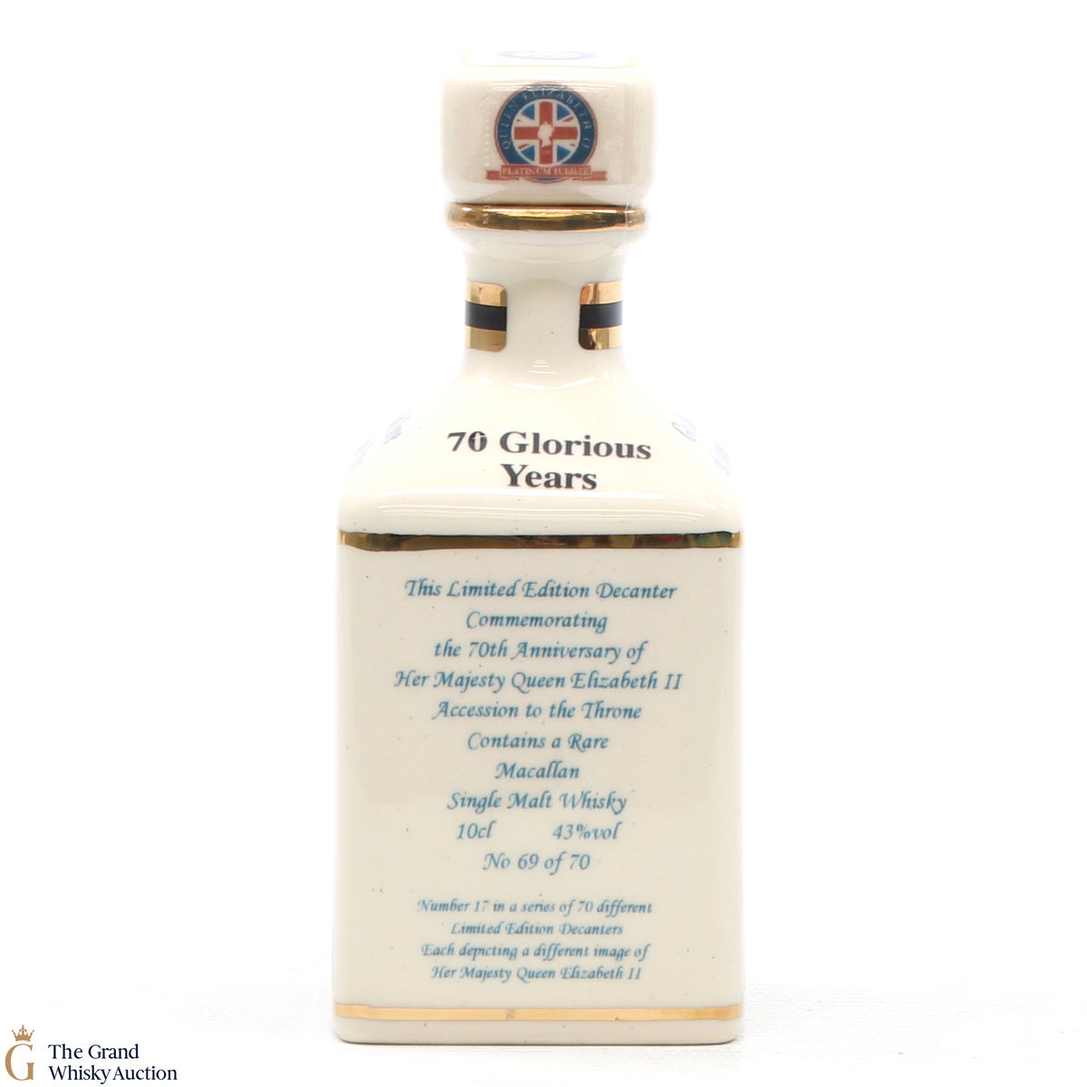 A mini decanter commemorating the 70th Anniversary of Her Majesty Queen Elizabeth II Accession to the Throne. Filled with a rare Macallan, there were only 70 full sets released which consisted of 70 different bottles.