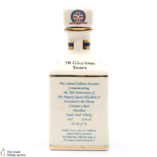 A mini decanter commemorating the 70th Anniversary of Her Majesty Queen Elizabeth II Accession to the Throne. Filled with a rare Macallan, there were only 70 full sets released which consisted of 70 different bottles.