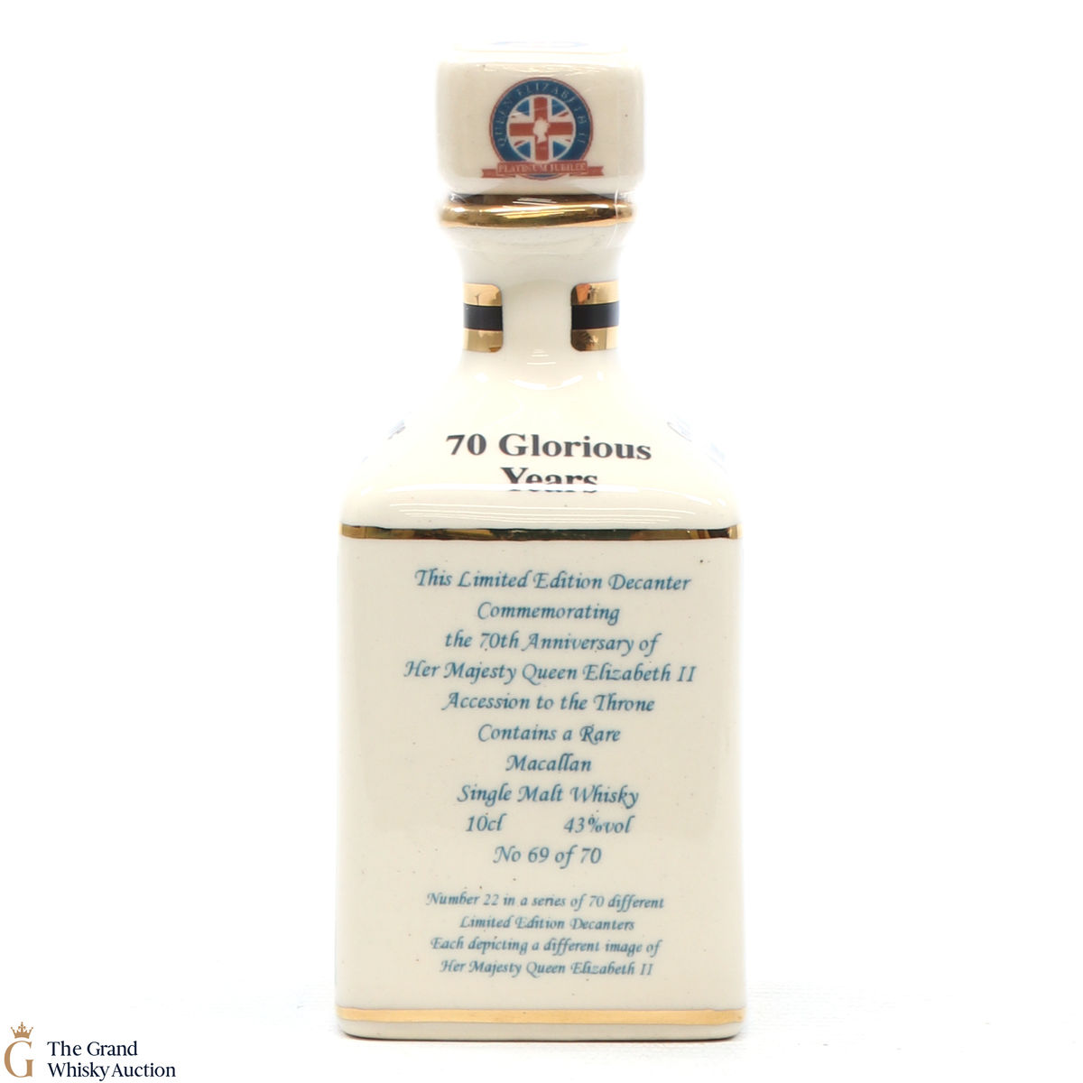A mini decanter commemorating the 70th Anniversary of Her Majesty Queen Elizabeth II Accession to the Throne. Filled with a rare Macallan, there were only 70 full sets released which consisted of 70 different bottles.