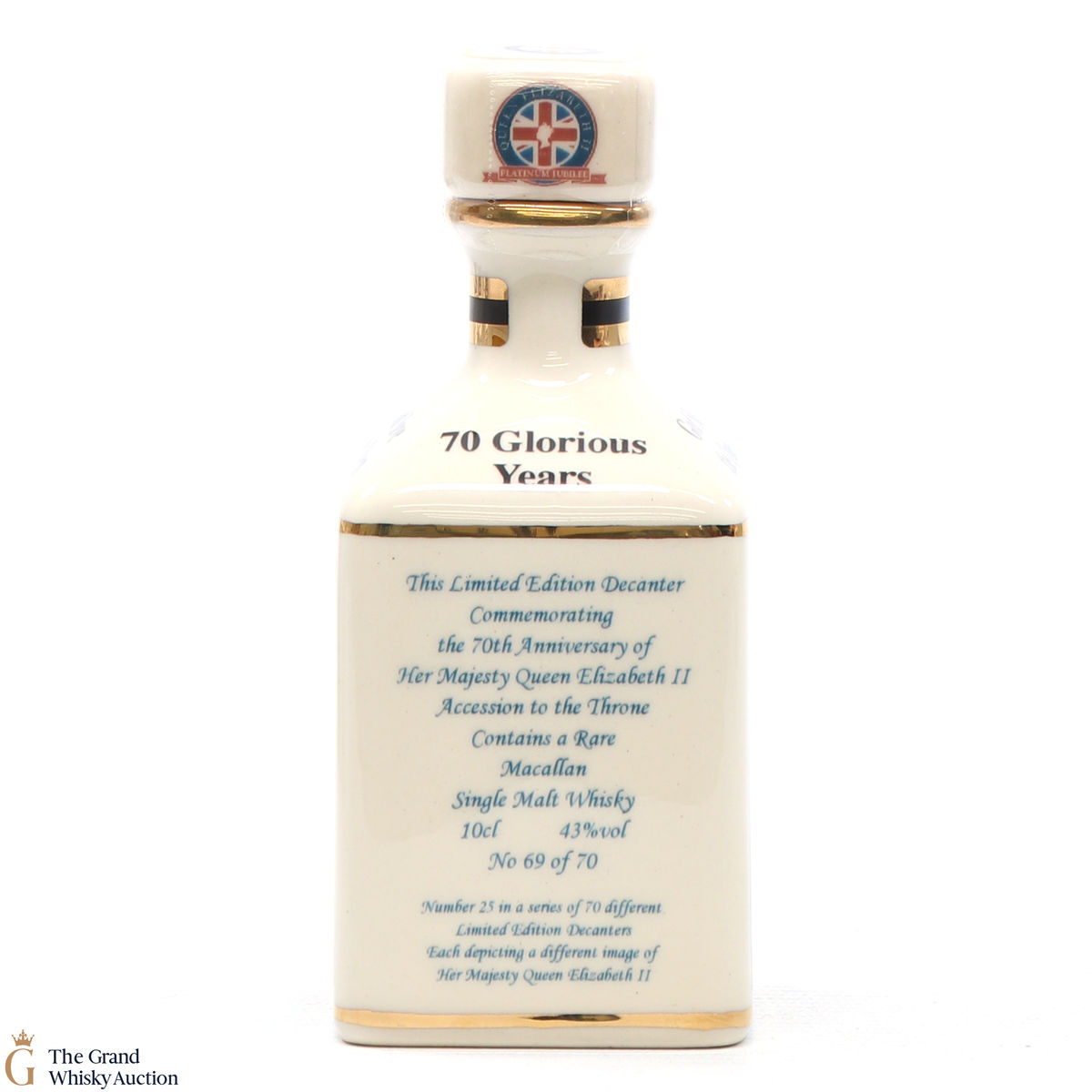 A mini decanter commemorating the 70th Anniversary of Her Majesty Queen Elizabeth II Accession to the Throne. Filled with a rare Macallan, there were only 70 full sets released which consisted of 70 different bottles.