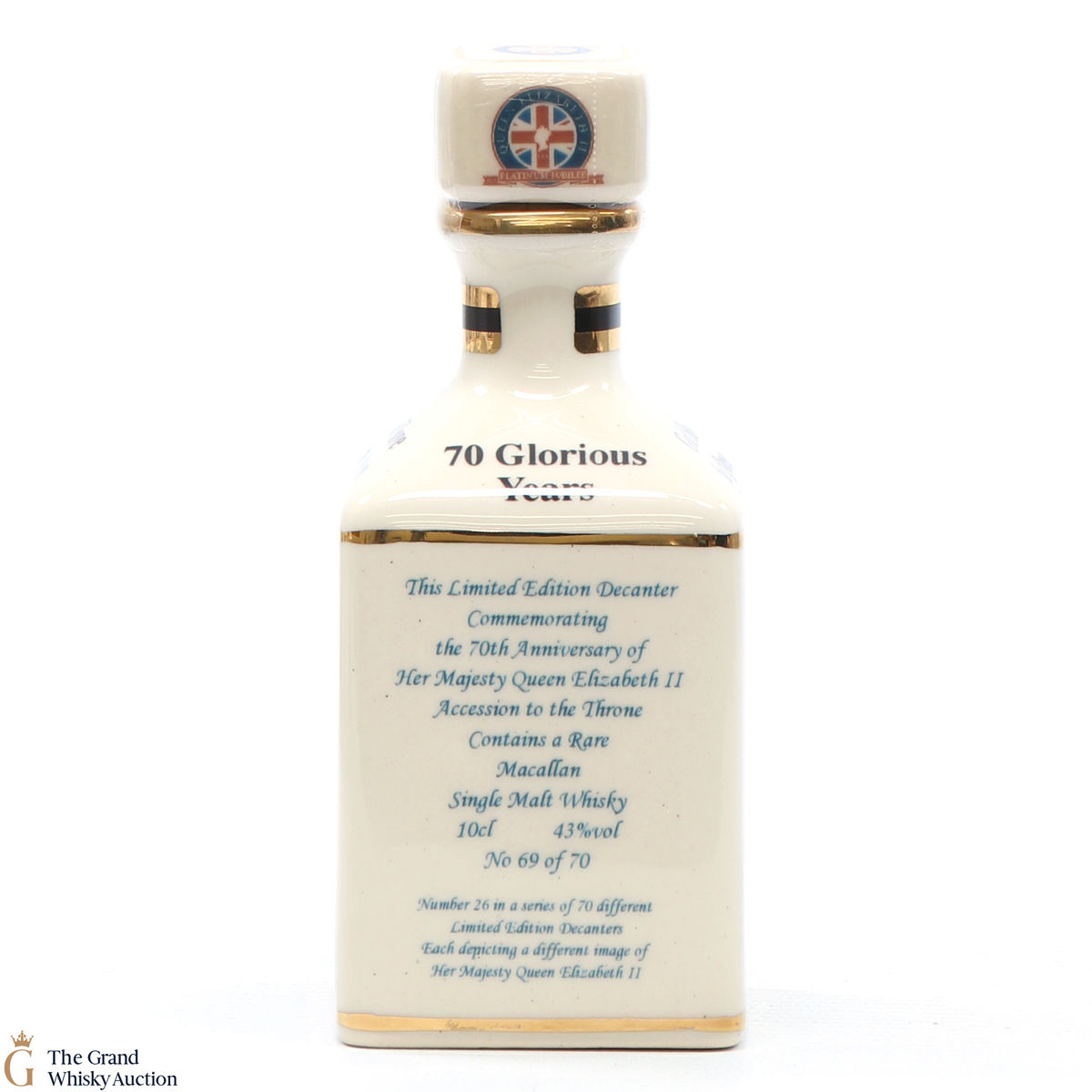 A mini decanter commemorating the 70th Anniversary of Her Majesty Queen Elizabeth II Accession to the Throne. Filled with a rare Macallan, there were only 70 full sets released which consisted of 70 different bottles.