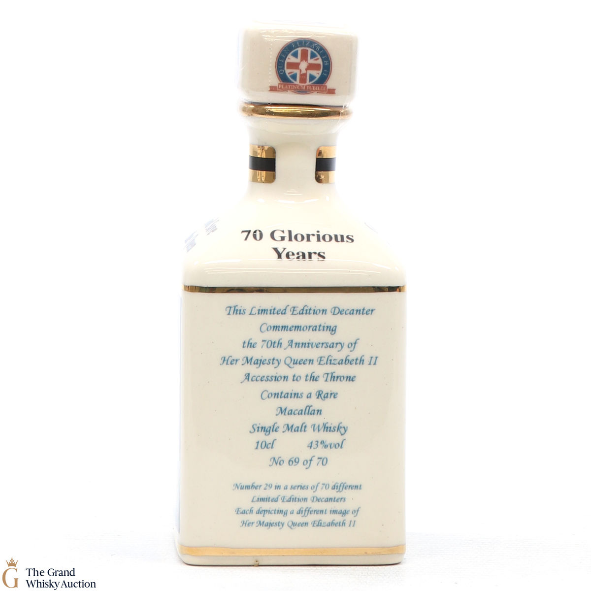 A mini decanter commemorating the 70th Anniversary of Her Majesty Queen Elizabeth II Accession to the Throne. Filled with a rare Macallan, there were only 70 full sets released which consisted of 70 different bottles.