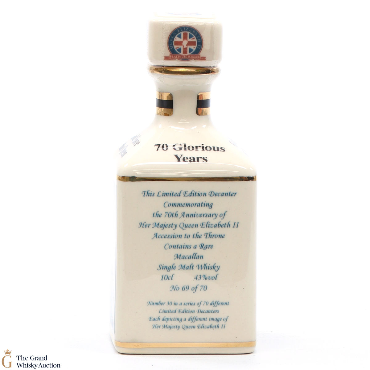 A mini decanter commemorating the 70th Anniversary of Her Majesty Queen Elizabeth II Accession to the Throne. Filled with a rare Macallan, there were only 70 full sets released which consisted of 70 different bottles.