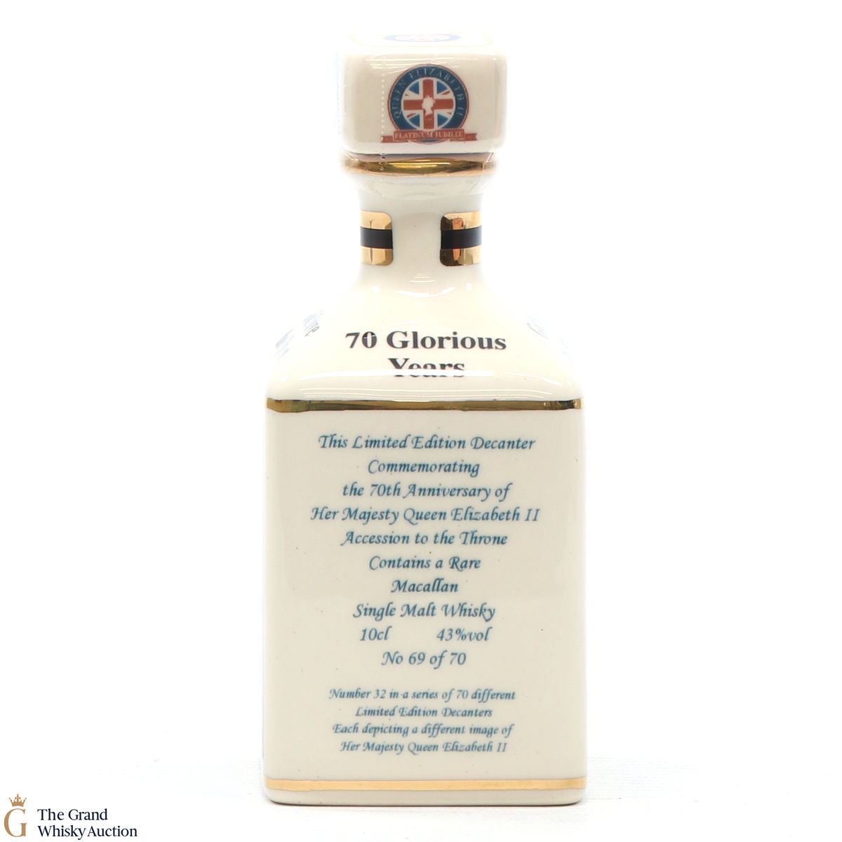 A mini decanter commemorating the 70th Anniversary of Her Majesty Queen Elizabeth II Accession to the Throne. Filled with a rare Macallan, there were only 70 full sets released which consisted of 70 different bottles.