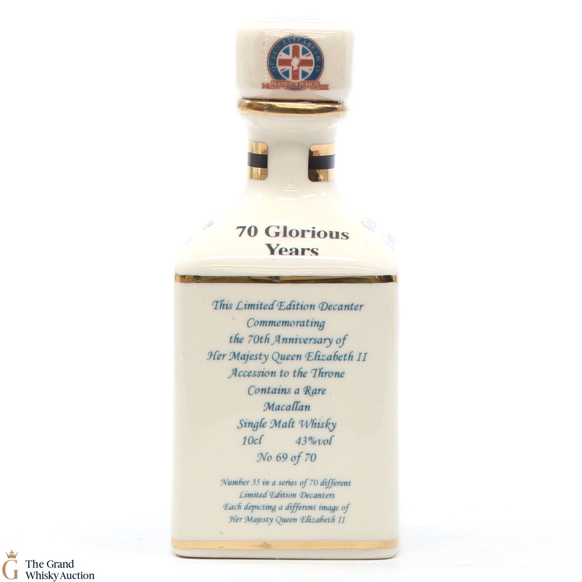 A mini decanter commemorating the 70th Anniversary of Her Majesty Queen Elizabeth II Accession to the Throne. Filled with a rare Macallan, there were only 70 full sets released which consisted of 70 different bottles.