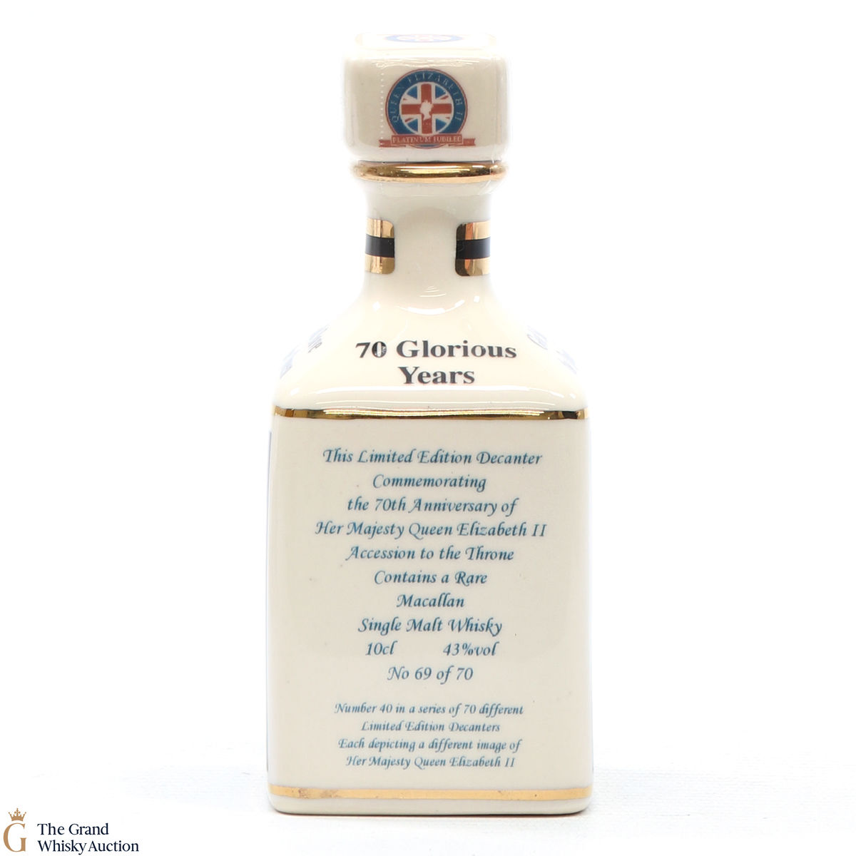 A mini decanter commemorating the 70th Anniversary of Her Majesty Queen Elizabeth II Accession to the Throne. Filled with a rare Macallan, there were only 70 full sets released which consisted of 70 different bottles.