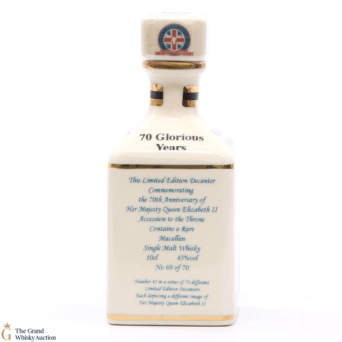 A mini decanter commemorating the 70th Anniversary of Her Majesty Queen Elizabeth II Accession to the Throne. Filled with a rare Macallan, there were only 70 full sets released which consisted of 70 different bottles.