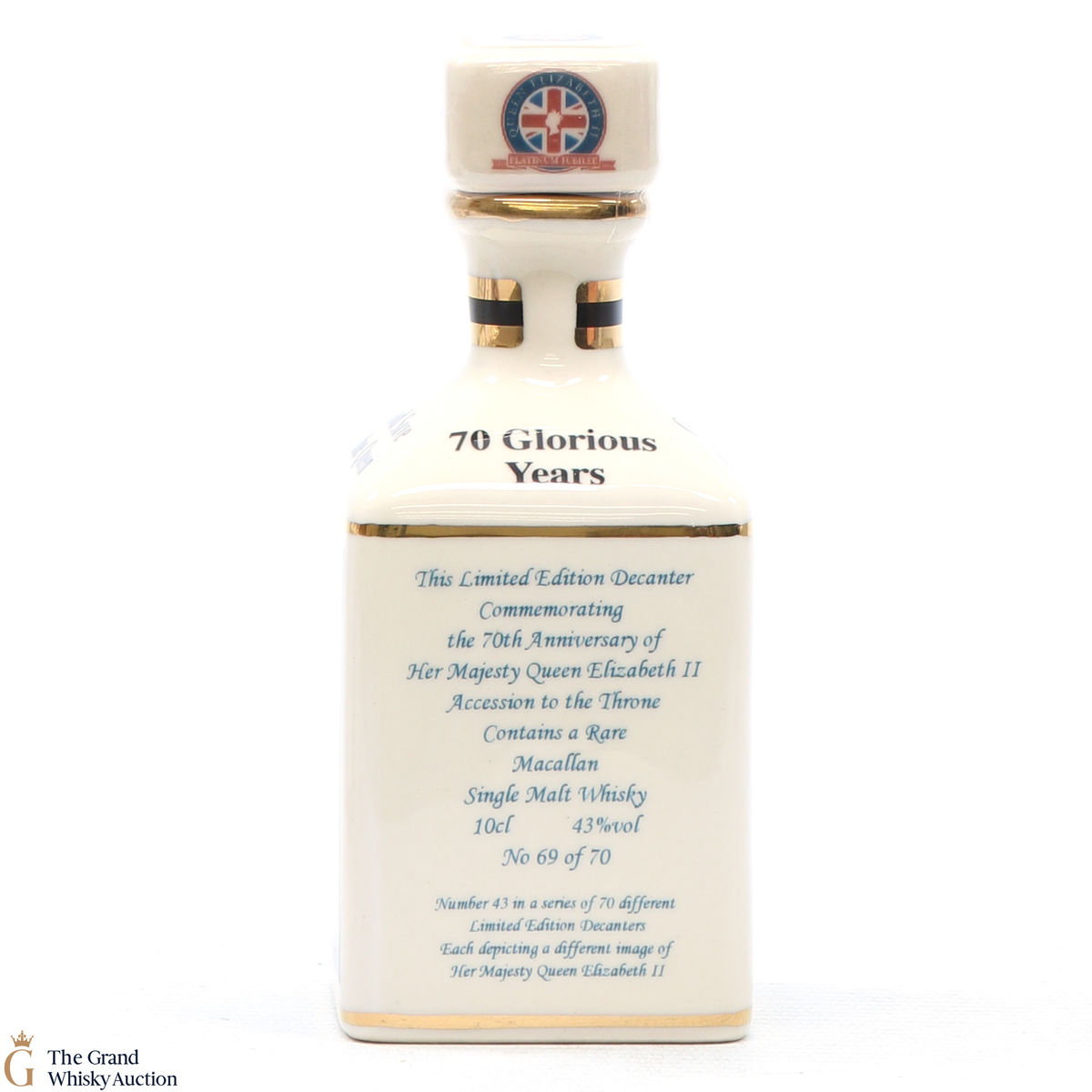 A mini decanter commemorating the 70th Anniversary of Her Majesty Queen Elizabeth II Accession to the Throne. Filled with a rare Macallan, there were only 70 full sets released which consisted of 70 different bottles.