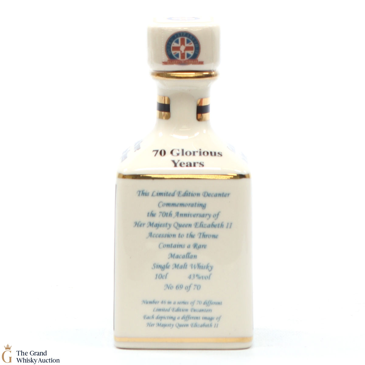 A mini decanter commemorating the 70th Anniversary of Her Majesty Queen Elizabeth II Accession to the Throne. Filled with a rare Macallan, there were only 70 full sets released which consisted of 70 different bottles.
