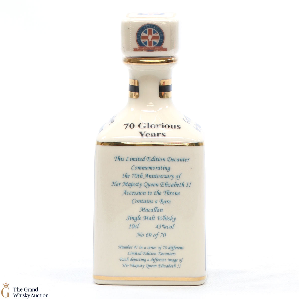 A mini decanter commemorating the 70th Anniversary of Her Majesty Queen Elizabeth II Accession to the Throne. Filled with a rare Macallan, there were only 70 full sets released which consisted of 70 different bottles.