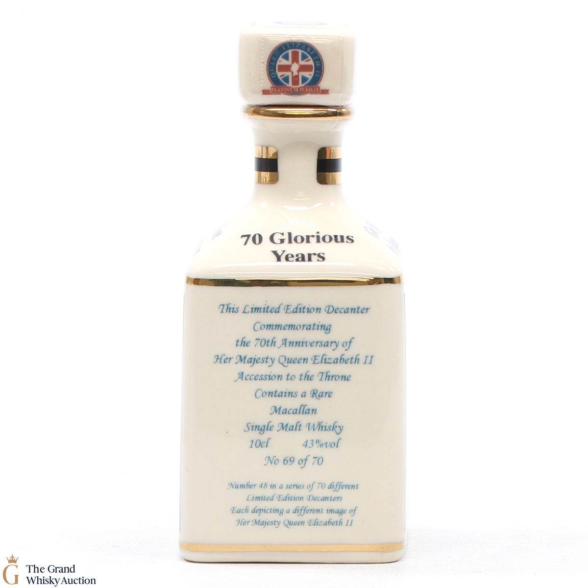 A mini decanter commemorating the 70th Anniversary of Her Majesty Queen Elizabeth II Accession to the Throne. Filled with a rare Macallan, there were only 70 full sets released which consisted of 70 different bottles.