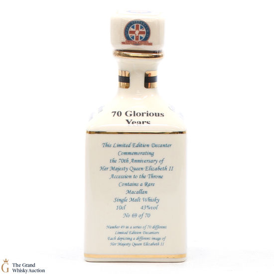A mini decanter commemorating the 70th Anniversary of Her Majesty Queen Elizabeth II Accession to the Throne. Filled with a rare Macallan, there were only 70 full sets released which consisted of 70 different bottles.