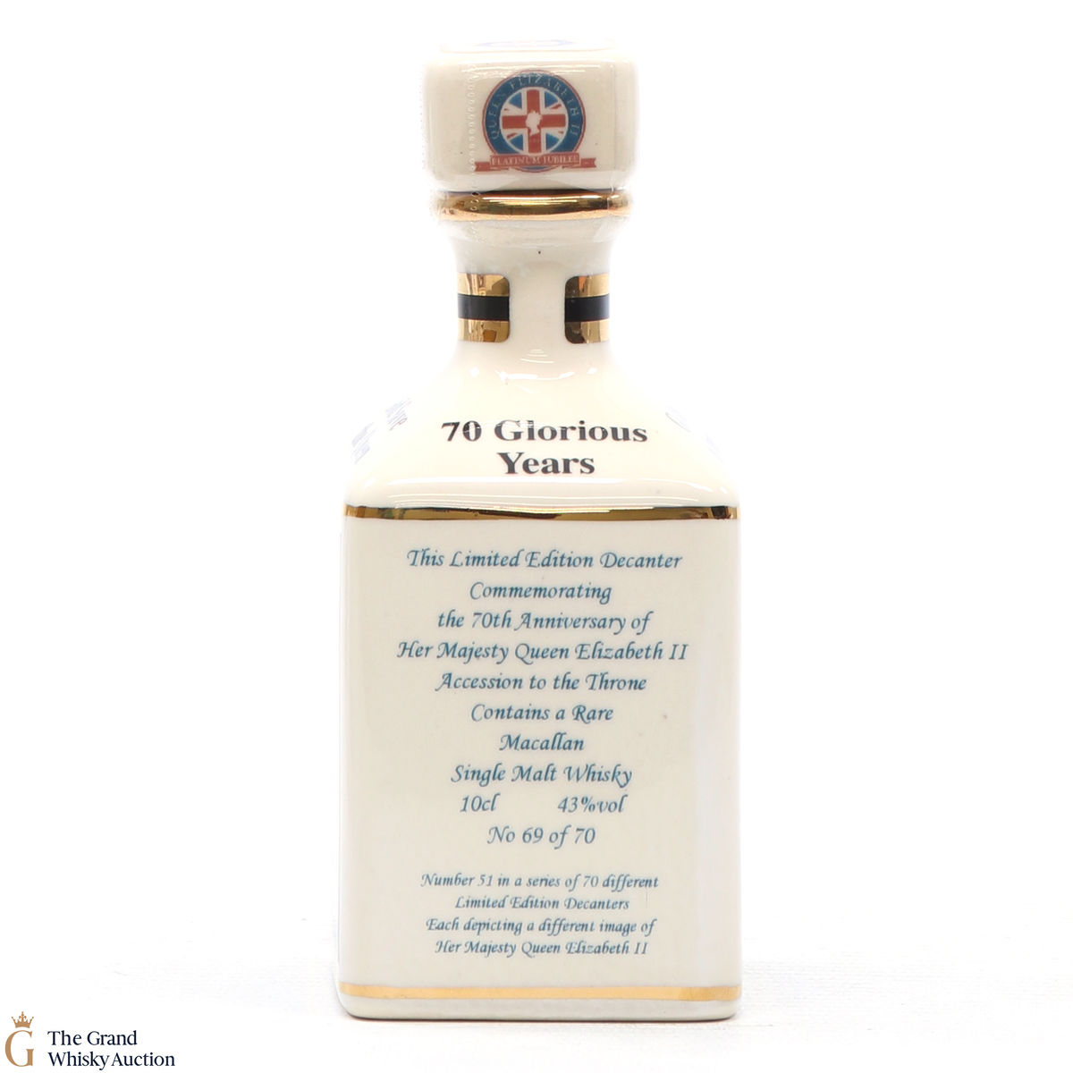 A mini decanter commemorating the 70th Anniversary of Her Majesty Queen Elizabeth II Accession to the Throne. Filled with a rare Macallan, there were only 70 full sets released which consisted of 70 different bottles.