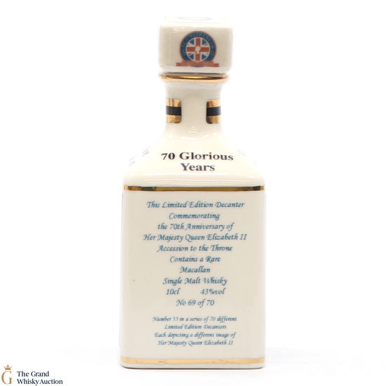 A mini decanter commemorating the 70th Anniversary of Her Majesty Queen Elizabeth II Accession to the Throne. Filled with a rare Macallan, there were only 70 full sets released which consisted of 70 different bottles.