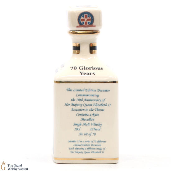 A mini decanter commemorating the 70th Anniversary of Her Majesty Queen Elizabeth II Accession to the Throne. Filled with a rare Macallan, there were only 70 full sets released which consisted of 70 different bottles.