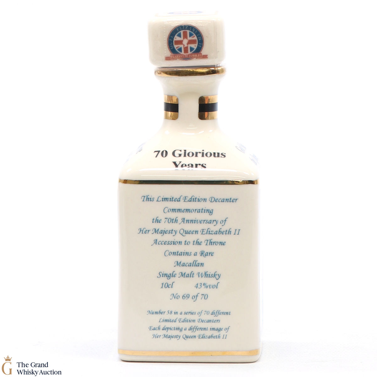 A mini decanter commemorating the 70th Anniversary of Her Majesty Queen Elizabeth II Accession to the Throne. Filled with a rare Macallan, there were only 70 full sets released which consisted of 70 different bottles.