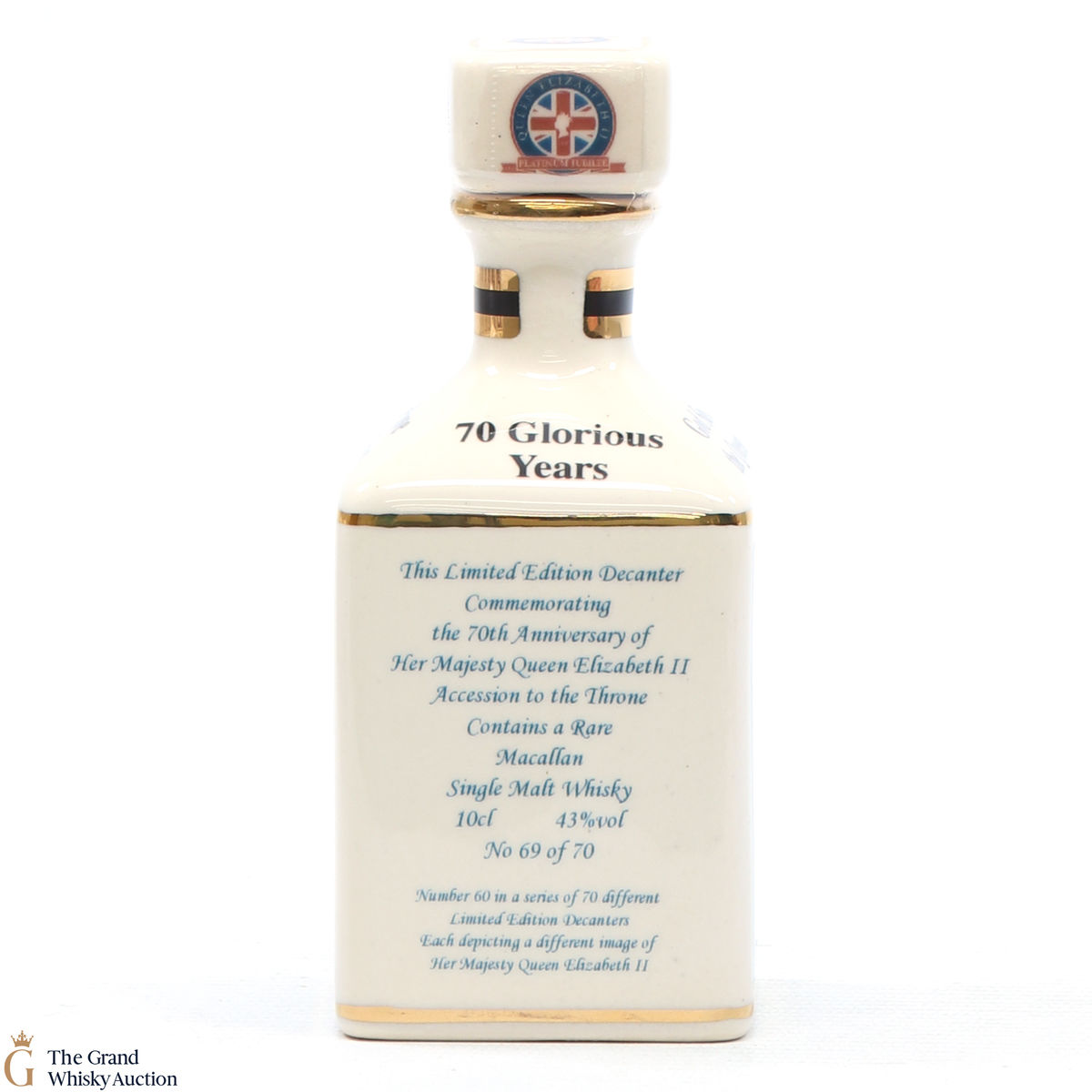 A mini decanter commemorating the 70th Anniversary of Her Majesty Queen Elizabeth II Accession to the Throne. Filled with a rare Macallan, there were only 70 full sets released which consisted of 70 different bottles.