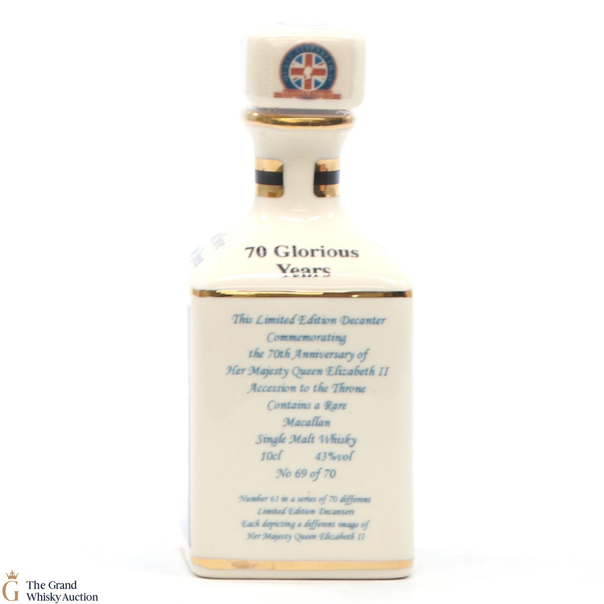 A mini decanter commemorating the 70th Anniversary of Her Majesty Queen Elizabeth II Accession to the Throne. Filled with a rare Macallan, there were only 70 full sets released which consisted of 70 different bottles.