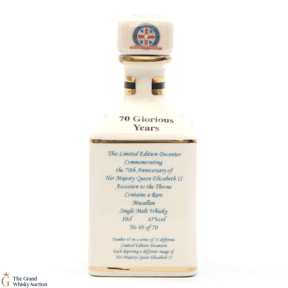 A mini decanter commemorating the 70th Anniversary of Her Majesty Queen Elizabeth II Accession to the Throne. Filled with a rare Macallan, there were only 70 full sets released which consisted of 70 different bottles.