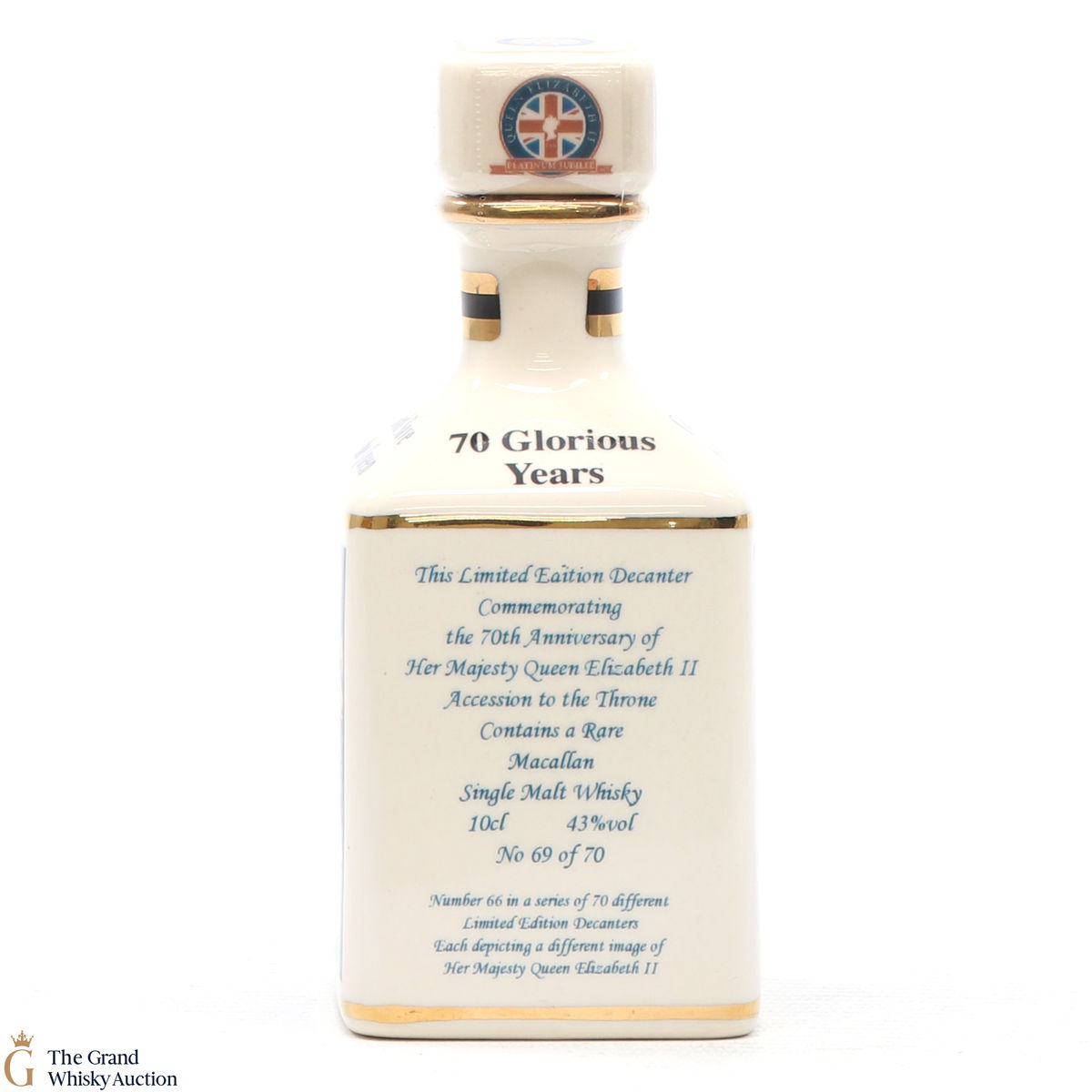 A mini decanter commemorating the 70th Anniversary of Her Majesty Queen Elizabeth II Accession to the Throne. Filled with a rare Macallan, there were only 70 full sets released which consisted of 70 different bottles.