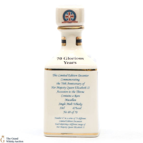 A mini decanter commemorating the 70th Anniversary of Her Majesty Queen Elizabeth II Accession to the Throne. Filled with a rare Macallan, there were only 70 full sets released which consisted of 70 different bottles.