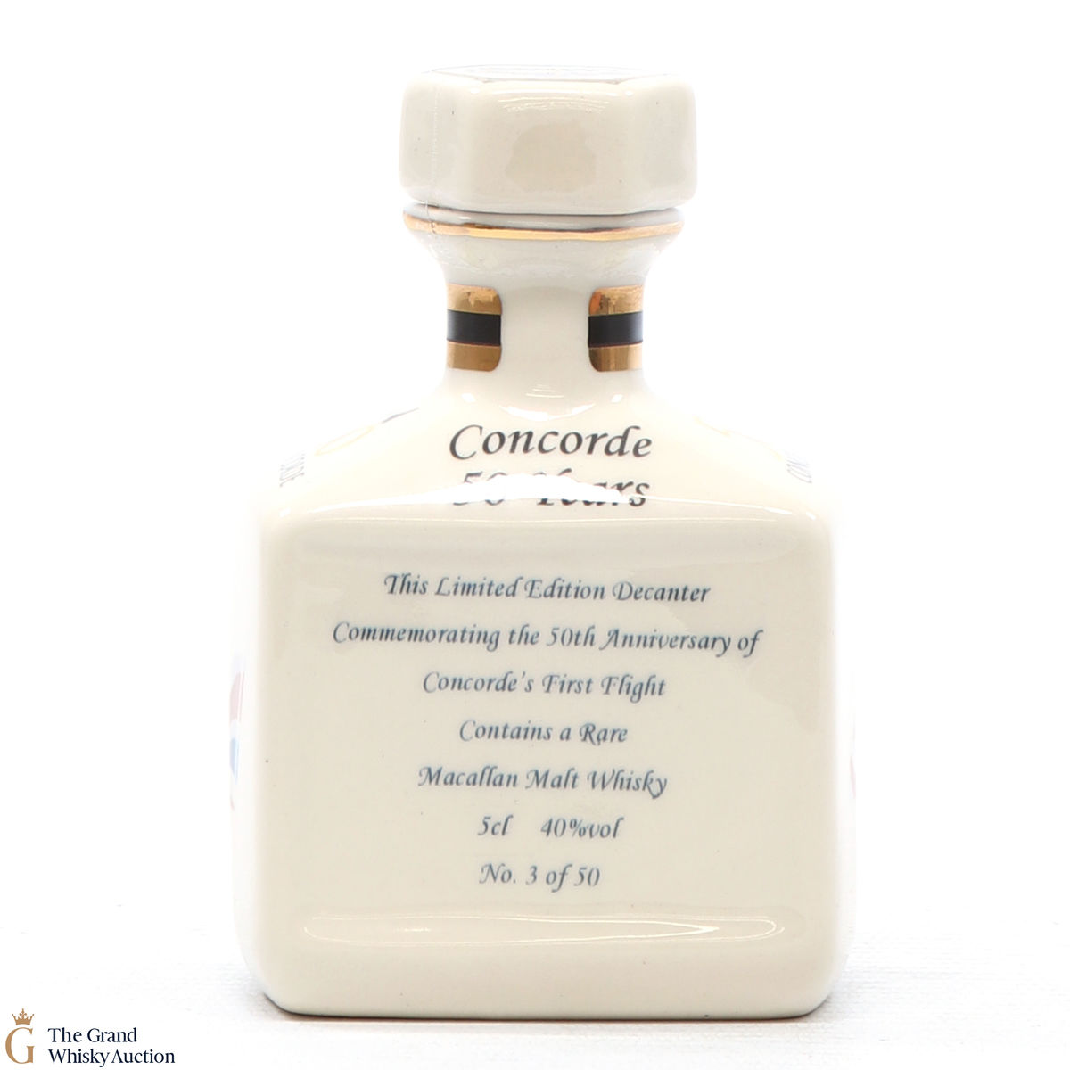 A mini decanter commemorating the 50th anniversary of Concorde's First Flight. Filled with Macallan, this is one of 50 bottles released.