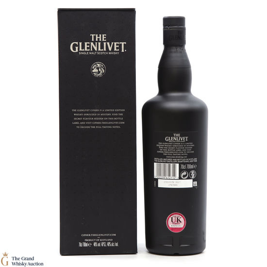 A limited-edition single malt whisky from The Glenlivet's Master Distiller, Alan Winchester. The Glenlivet Cipher comes in an opaque black bottle without cask information, tasting notes and age statement. This bottle is surrounded by mystery. You are encouraged to find the secret flavour hidden on the bottle label and visit the Cipher website for full tasting notes.