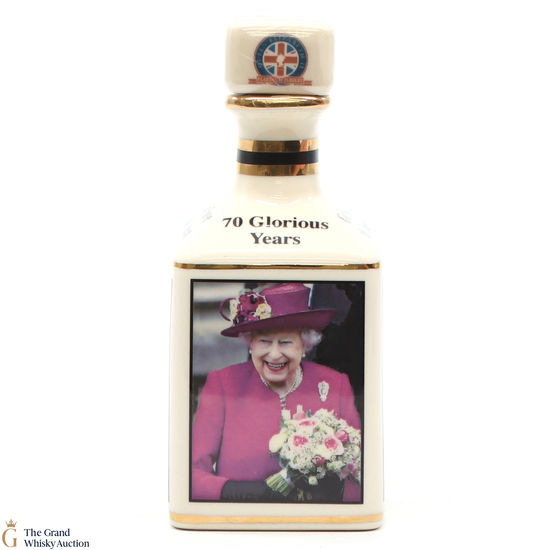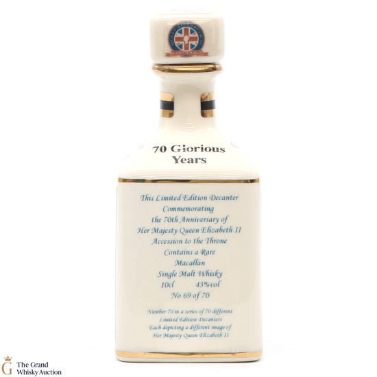 A mini decanter commemorating the 70th Anniversary of Her Majesty Queen Elizabeth II Accession to the Throne. Filled with a rare Macallan, there were only 70 full sets released which consisted of 70 different bottles.