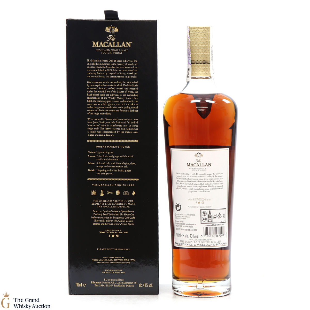 This annual release of The Macallan's popular 18 Year Old Sherry Oak is matured exclusively in sherry seasoned casks, built from both Spanish and American oak, providing a beautifully dark flavour with rich aromas.