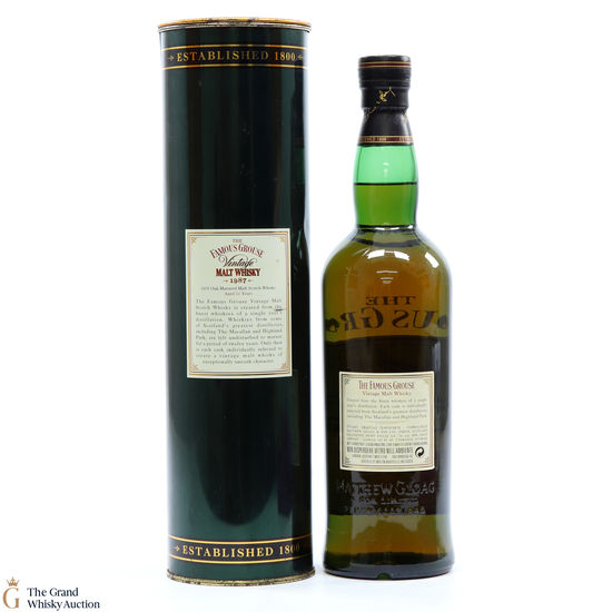 This is the bottling of Famous Grouse - 1987 Vintage, which was released following the success of the 1986 vintage. This vatted malt from Famous Grouse includes Highland Park and Macallan.