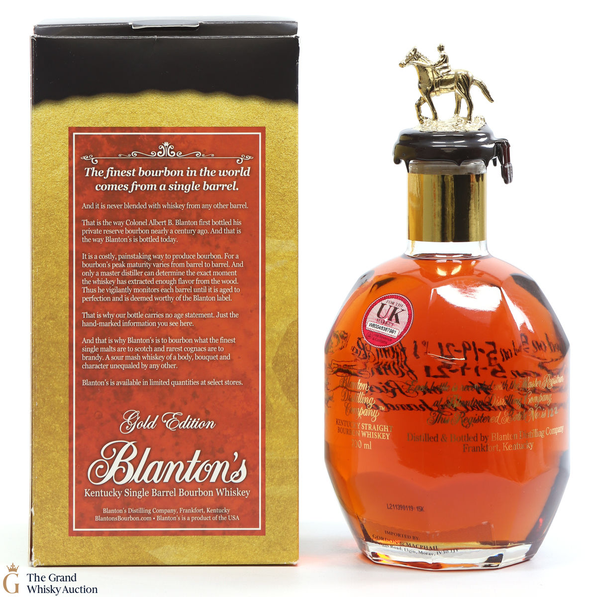 PLEASE NOTE: The wax seal on Blanton's bottles are prone to cracking in transit due to their design. Therefore, as stated in our T&C’s, we do not and will not accept liability should the seal be breached, broken, split or leak in transit. Additionally, please know due to the design of the internal cardboard packaging that surrounds the top of the bottles, it too may be torn. By bidding on this lot you have understood this to be true. Insurance is for complete breakage or loss in transit only.