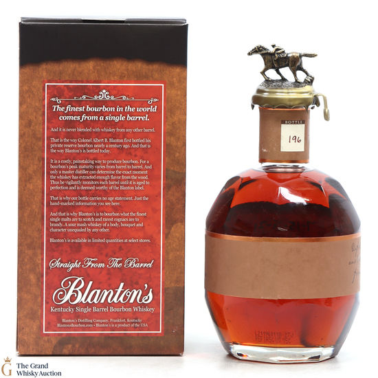 PLEASE NOTE: The wax seal on Blanton's bottles are prone to cracking in transit due to their design. Therefore, as stated in our T&C’s, we do not and will not accept liability should the seal be breached, broken, split or leak in transit. Additionally, please know due to the design of the internal cardboard packaging that surrounds the top of the bottles, it too may be torn. By bidding on this lot you have understood this to be true. Insurance is for complete breakage or loss in transit only.