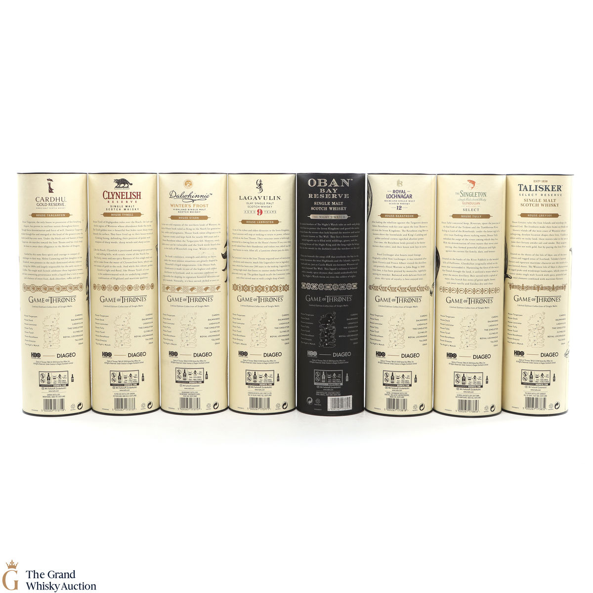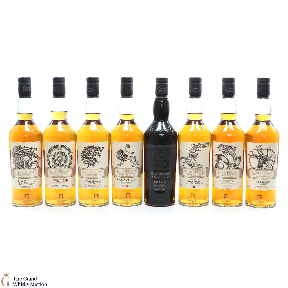 Each of the Game of Thrones Scotch whiskies has been paired with a particular house from the seven kingdoms in the television series, plus the Night’s Watch guard.