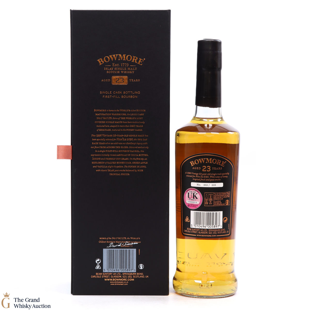 Distilled at Bowmore Distillery in 1996, this single malt was matured exclusively in a single first fill bourbon barrel for 23 years. Bottled to celebrate one of the biggest whisky events of the year, Feis Ile, this bottling was originally intended to be released for the 2020 festival before the event was canceled. An incredibly rare whisky, only 225 bottles were produced.