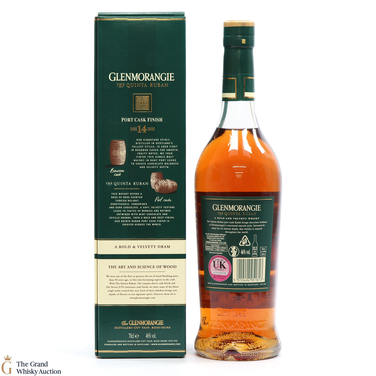Glenmorangie Quinta Ruban is matured in bourbon casks before finishing in the finest Ruby Port casks from the "Quintas" or wine estates of Portugal. Ruban is Gaelic for Ruby.