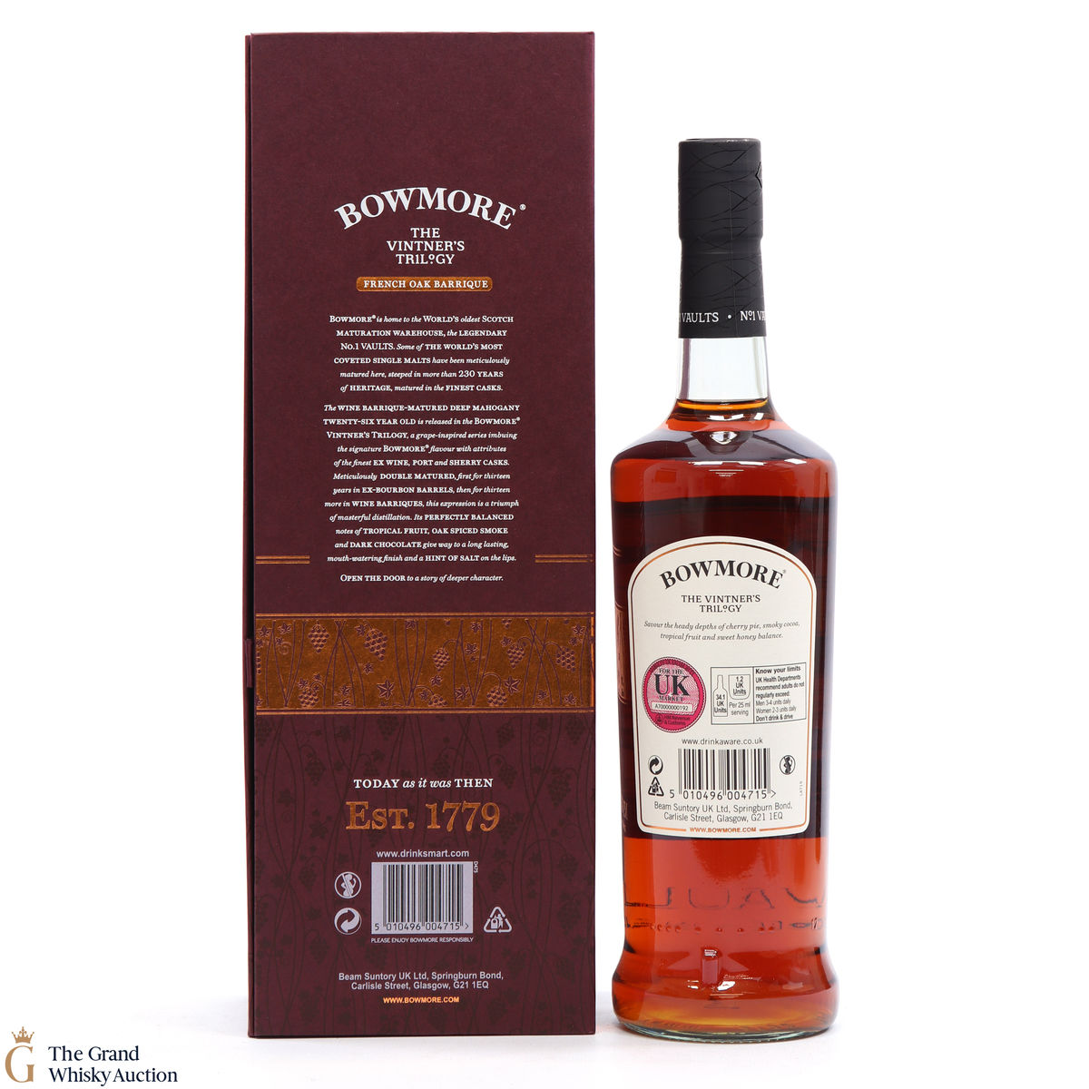 This is the second release in Bowmore's Vintner's Trilogy - each released with different wine finish. This 26-year-old was double matured; for the first 13 years, it was aged in bourbon barrels, then aged for the remaining 13 years in French Oak Barriques. The double maturation and wine finish has resulted in hints of oak spiced smoke and salty dark chocolate.