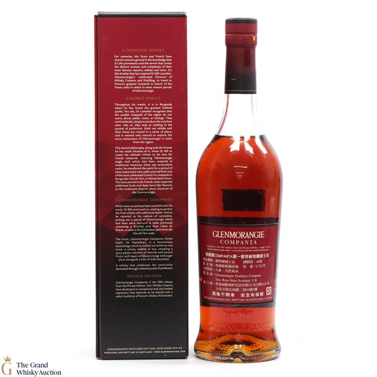 After first maturing in American white oak ex-bourbon barrels, the Companta was matured in 60% Burgundy wine casks from Clos de Tart and 40% Rhône Valley casks that previously held Rasteau, sourced by Glenmorangie's Director of Distilling, Dr. Bill Lumsden.
