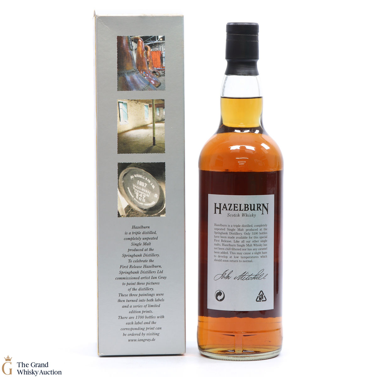 This lot has an 8 year bottle of Hazelburn which is a triple distilled, completley unpeated single malt produced at Campeltown's Springbank Distillery. To celebrate the First Release Hazelburn, Springbank Distillers Ltd commissioned artist Ian Gray to paint 3 pictures of the distillery. The 3 paintings were then turned into both labels and a series of limited edition prints.