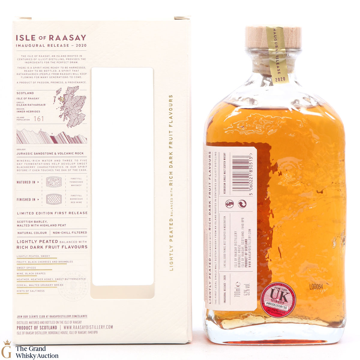 The inaugural release from the Isle of Raasay distillery is a limited edition release matured in first-fill American oak, and finished in 21 exclusive first fill Bordeaux red wine casks. They have created an elegant, lightly peated (15-20 Peat or Phenol Parts Per Million). Bottled at 52% and in a unique glass bottle which captures the island's geology.