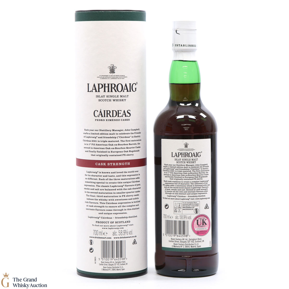 The 2021 edition of Laphroaigs Cairdeas series was first matured in a 1st fill American oak ex-bourbon barrel, then in an American oak ex-bourbon quarter cask before finally being finished in European PX sherry casks. Bottled at the cask strength of 58.9% ABV in 2021 to celebrate the Friends of Laphroaig.