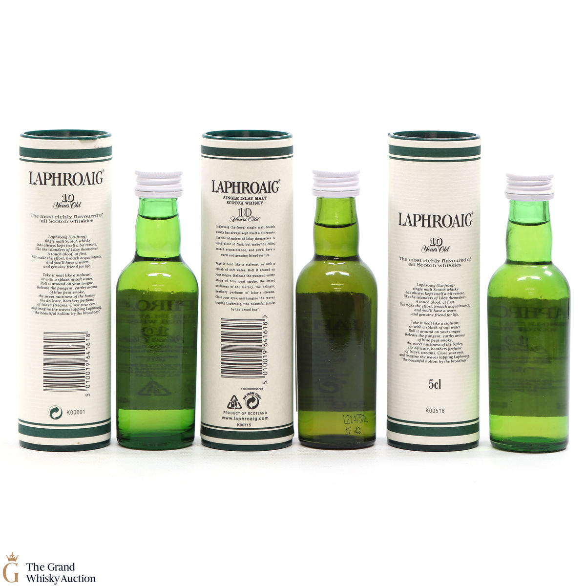 This lot includes 3 x 5cl bottlings of the medicinal 10-year-old from Islay's bestselling distillery, Laphroaig. In making Laphroaig, malted barley is dried over a peat fire. The smoke from this peat, found only on Islay, gives Laphroaig its particularly rich flavour.