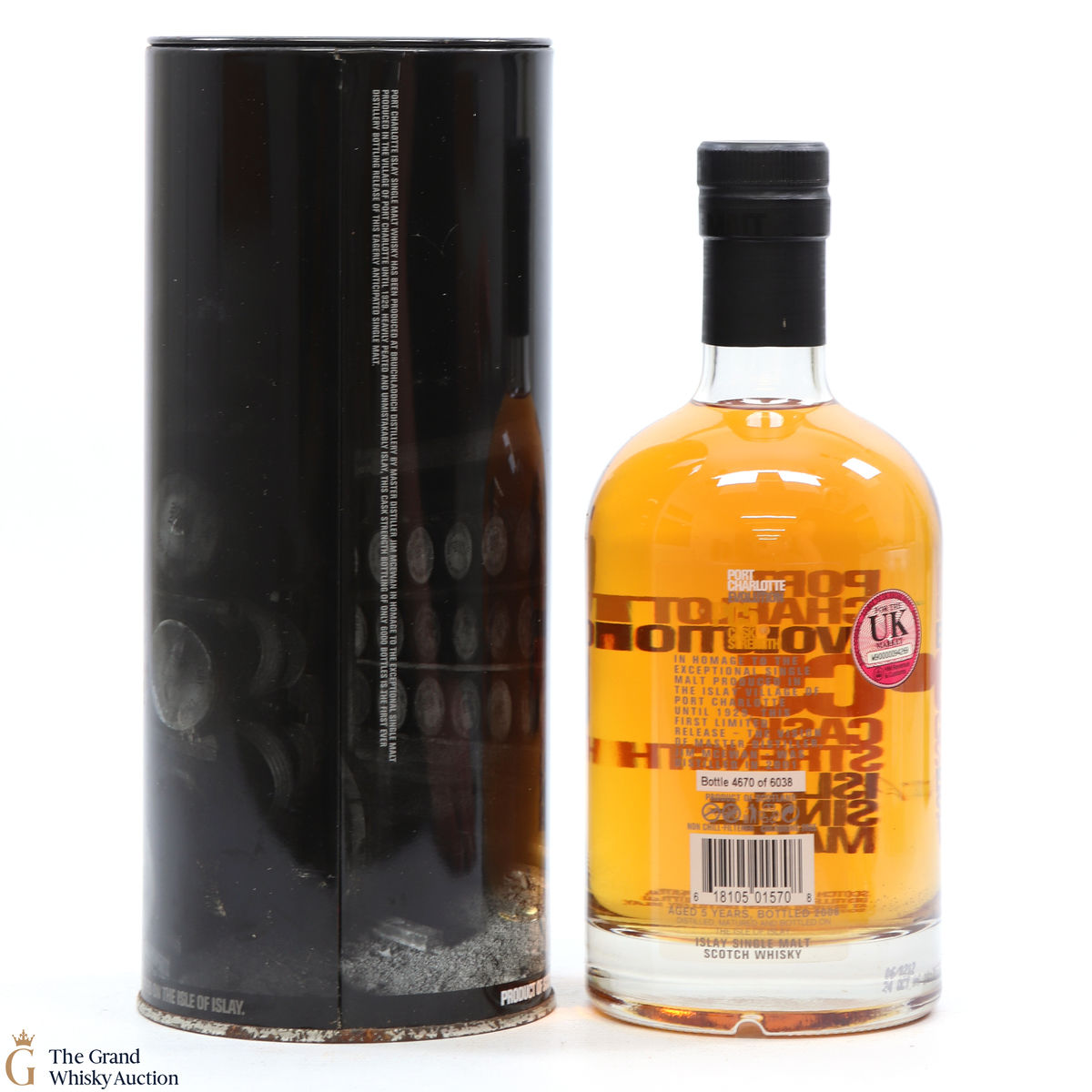 Port Charlotte PC5, produced by Bruichladdich Distillery, is a heavily peated spirit. It was the first release of heavily peated Port Charlotte and was produced in 2001 from some of the first spirits to be produced after the distillery's reopening. The single malt was bottled at 5 years old in 2006 and was limited to 6038 bottles.