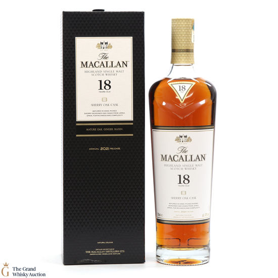This annual release of The Macallan's popular 18 Year Old Sherry Oak is matured exclusively in sherry seasoned casks, built from both Spanish and American oak, providing a beautifully dark flavour with rich aromas.