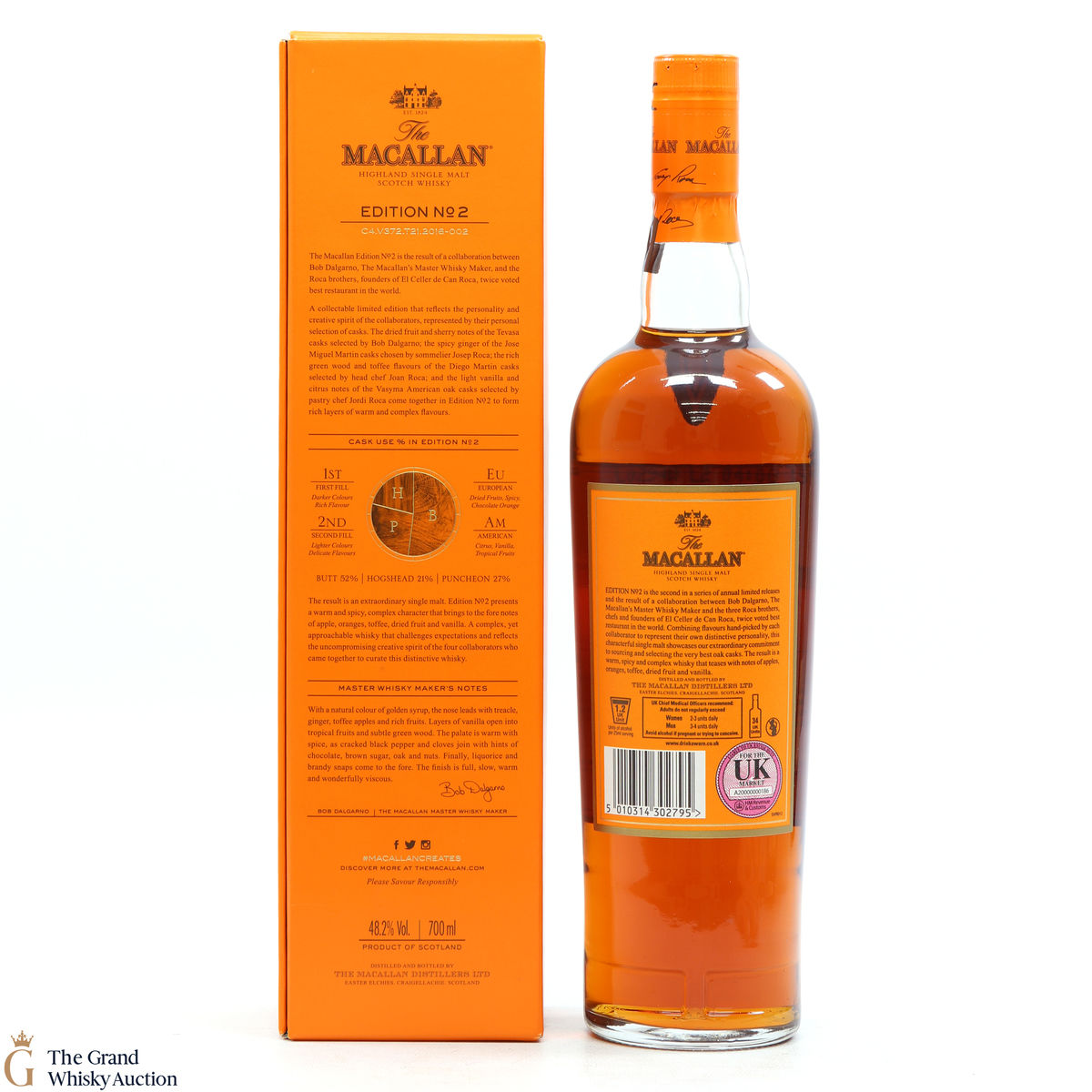 This is the second release from the Macallan Edition series. Edition No.2 is a collaboration between Macallan's master blender Bob Delgarno and legendary Spanish chefs Joan, Josep and Jordi Roca. The Rocas are the three brothers behind El Celler de Can Roca (named Best Restaurant in the World twice by Restaurant magazine). This single malt was drawn from a combination of sherry puncheons, butts and refill hogsheads.