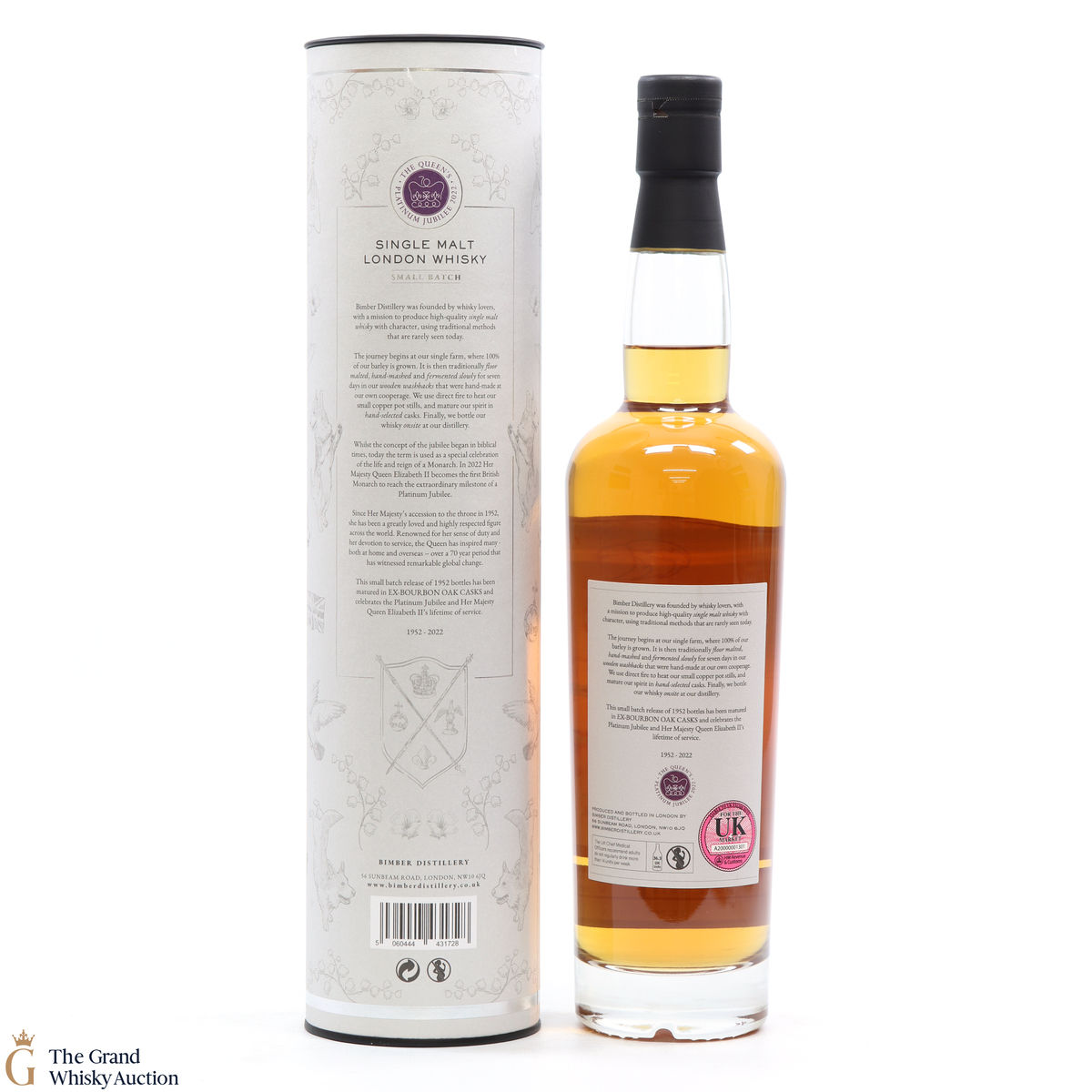 This Bimber limited edition small batch release celebrates the Platinum Jubilee of Queen Elizabeth II. Matured in ex-bourbon casks for four years before being bottled at a strength of 51.8% abv. One of 1,952 bottles.