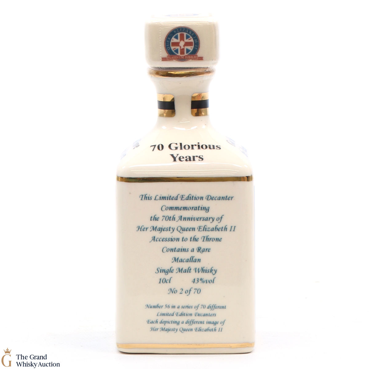 A mini decanter commemorating the 70th Anniversary of Her Majesty Queen Elizabeth II Accession to the Throne. Filled with a rare Macallan, there were only 70 full sets released which consisted of 70 different bottles.