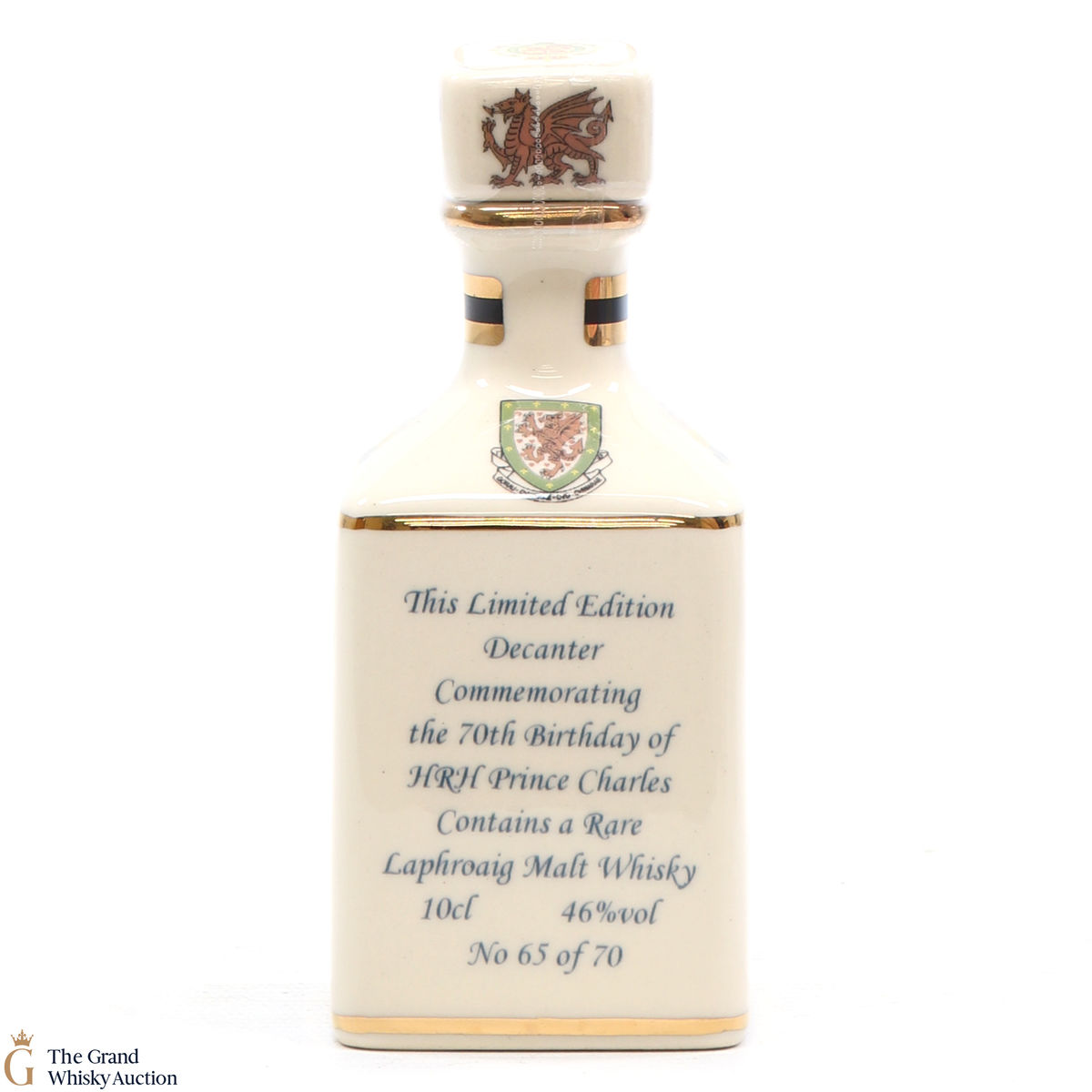 A mini decanter commemorating the 70th birthday of HRH Prince Charles. Filled with Laphroaig, this is one of 70 bottles released.
