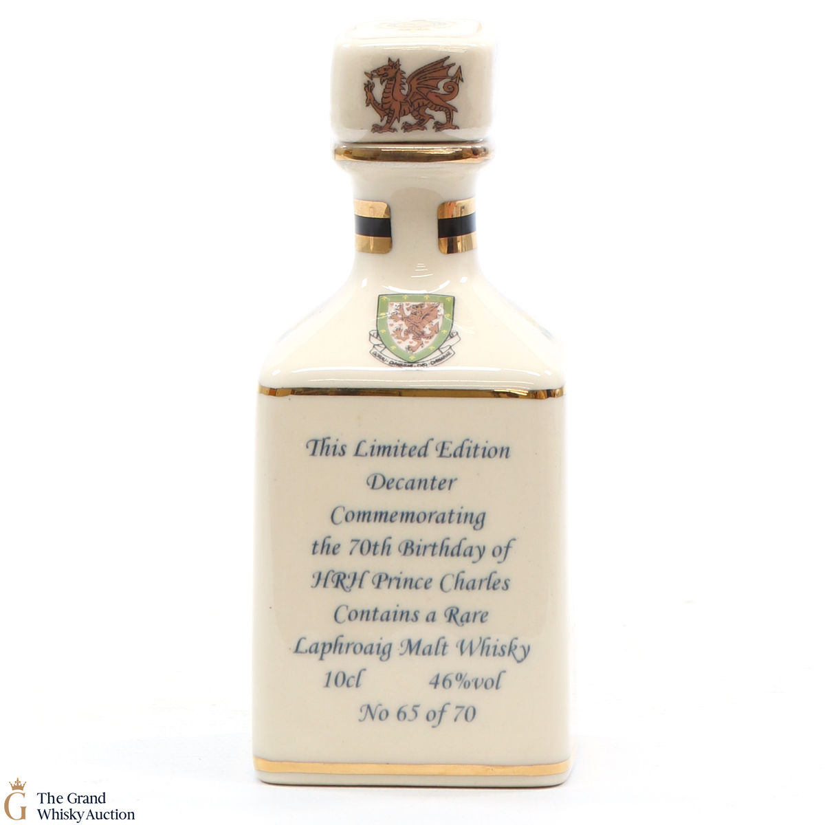 A mini decanter commemorating the 70th birthday of HRH Prince Charles. Filled with Laphroaig, this is one of 70 bottles released.