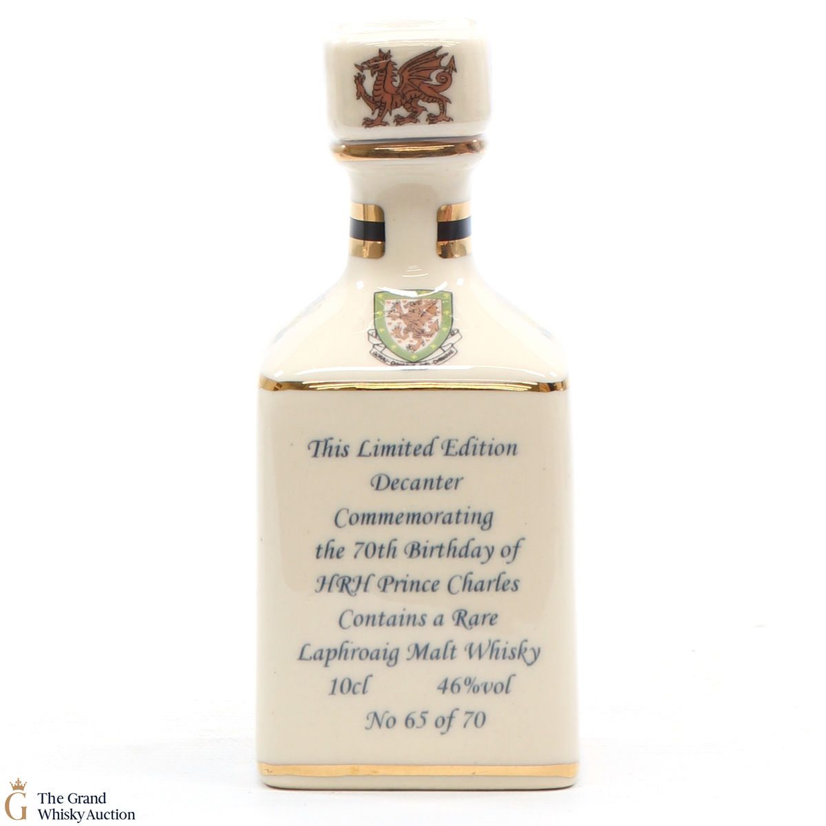 A mini decanter commemorating the 70th birthday of HRH Prince Charles. Filled with Laphroaig, this is one of 70 bottles released.